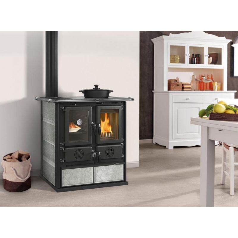 La cuisinière à bois Rosetta SX.16 en pierre naturelle de la marque La Nordica est un appareil qui vous permettra de chauffer votre logement jusqu'à 227 m3 mais aussi de cuisiner vos plats puisqu’il possède un four intégré d'une capacité de 28 litres et un piano de cuisson supérieur en fonte.