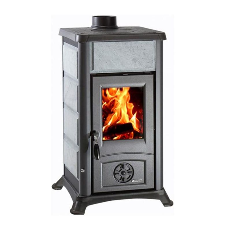 Le poêle a bois Gemma Lean Petra de la marque La Nordica possède un revêtement en pierre naturelle ainsi qu'une puissance nominale de 6 kW ce qui lui permet de chauffer une pièce jusqu'à 186 m3 et accepte des bûches de 25 cm.