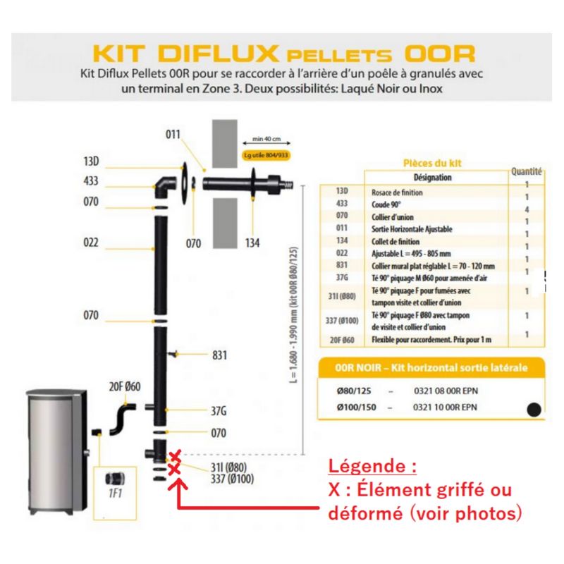 Le terminal horizontal bénéficie d'un test d'étanchéité pour l’évacuation individuelle des gaz de combustion et l’arrivée d’air comburant au poêle à granulés. La prise d'air sur le terminal est protégée et elle garantie le bon fonctionnement de toute l'installation. Le terminal doit dépasser au minimum de 40 cm à l'horizontale du mur extérieur. Les brides de sécurité sont montées d'usine sur les éléments pour faciliter la mise en œuvre et le laquage noir mat est réalisé avec une peinture de haute qualité.